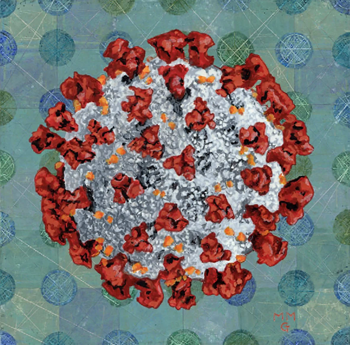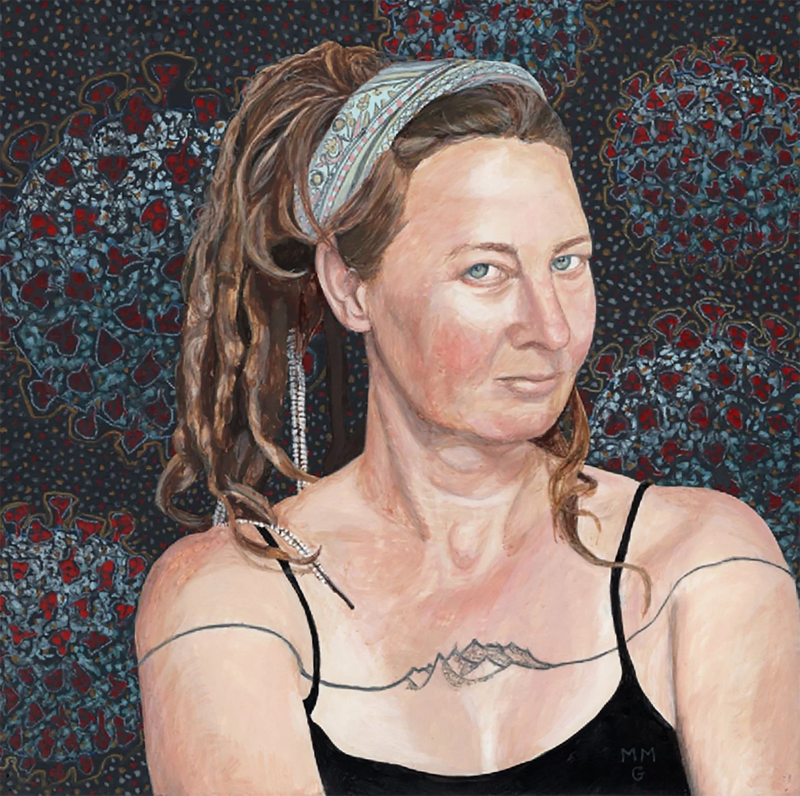 During the pandemic Miranda painted a great deal, trying to process the intensity of times through her imagery. Her little store in Santa Fe was closed for 2 ½ years. She and her husband went home and made stuff and worked on their house. They would draw on their big chalkboard every evening, around the time that the New Yorkers were going to their balconies and roof-tops to make noise in honor of the dead, and the caretakers and essential workers who held the fabric of our society together. Out of this came “pandemic chalkboard” which was a book and an installation at Axel Contemporary, as well as portraits that she painted.